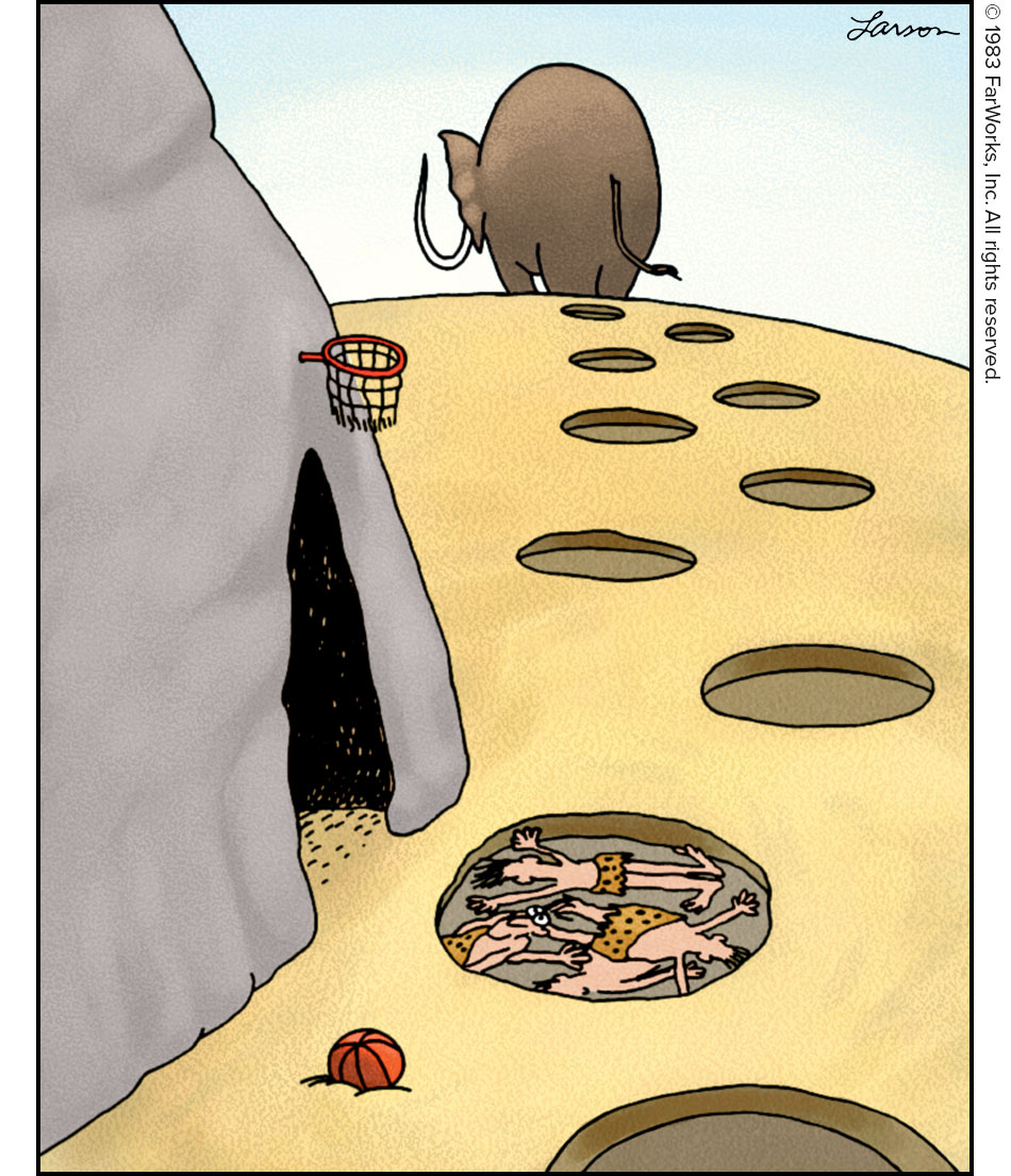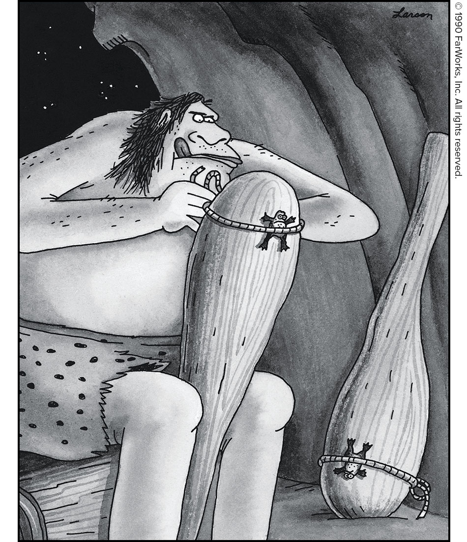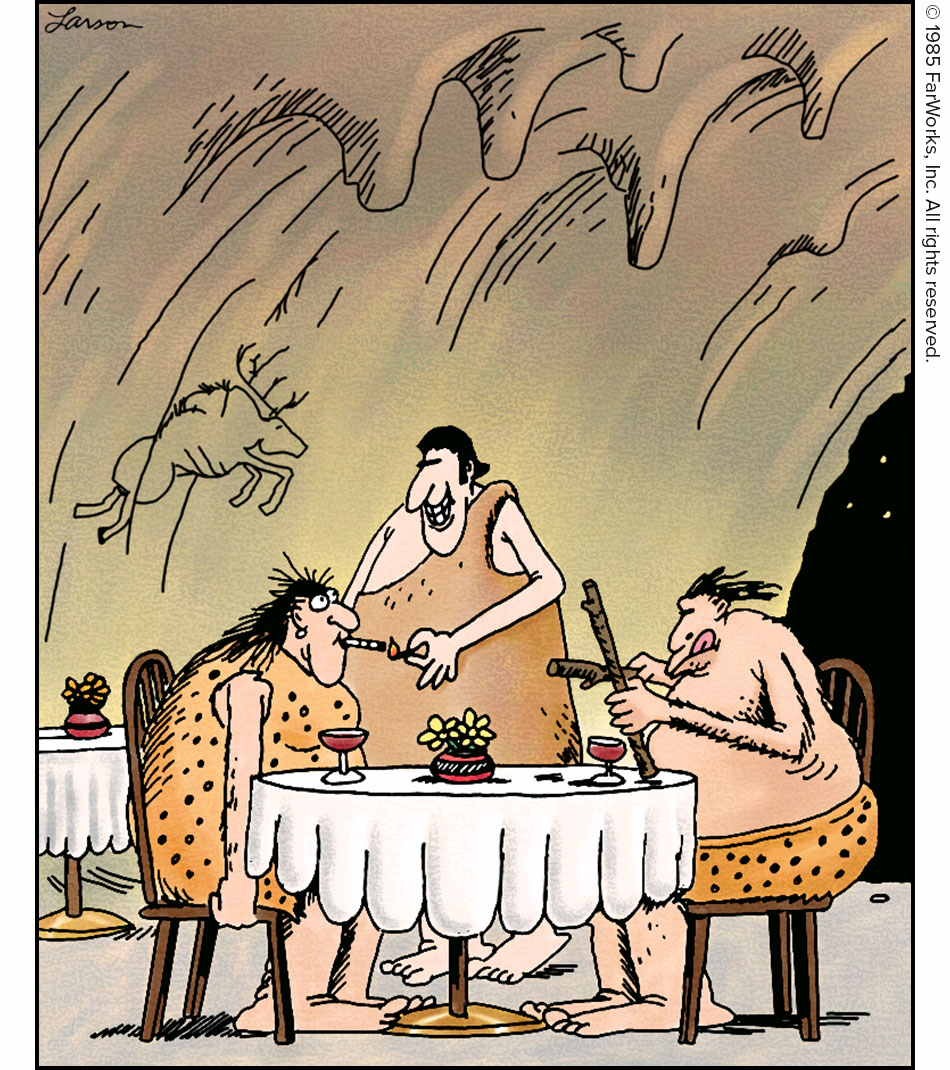 Thag hit his head on a stalactite and Grog laughed; humor begins.